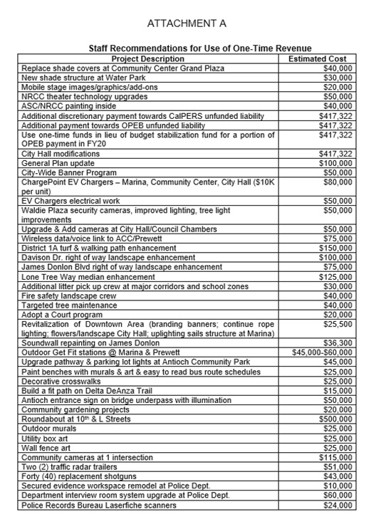 On Tuesday night, the Antioch City Council discussed how it would spend $417,322 in one-time revenues which it received from savings throughout the fiscal year.