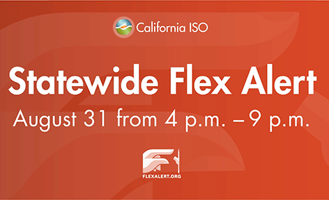 FOLSOM, Calif. – The California Independent System Operator (ISO) has issued a statewide Flex Alert, a call for voluntary electricity conservation, for today, Aug. 31 from 4 p.m. to 9 p.m., due to high temperatures pushing up energy demand and tightening available power supplies.