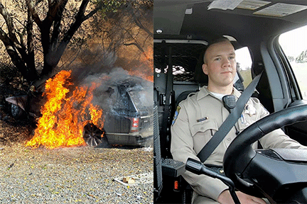 According to the California Highway Patrol, on August 8, CHP Officer Richman responded to a solo vehicle crash on Hwy-24 westbound, just east of the Orinda exit. Upon his arrival he saw that the solo vehicle had crashed into a tree and was catching fire.